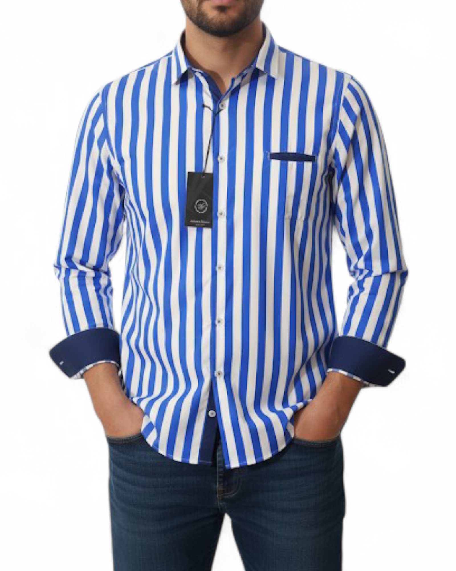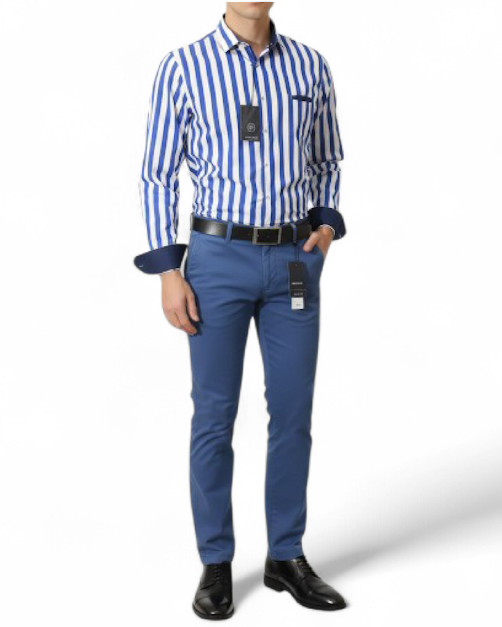Cette chemise rayée pour homme est un incontournable de la garde-robe masculine. Elle est très confortable à porter. Le col français classique lui donne une touche élégante, tandis que les rayures larges bleus et blanches lui confèrent une touche de style. La coupe slim fit mettra en valeur votre silhouette masculine.